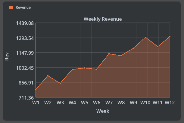 Track metrics across time with smooth or stepped lines, optional area fills, and per-point interactions.