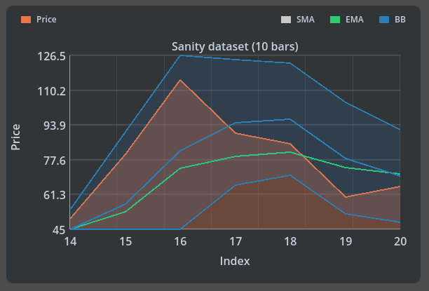 Overlays (SMA, EMA, Bollinger Bands) are enabled per series using an overlay mask that combines OverlayMask flags. Windows are expressed in samples (bars). You can either configure them after adding a series, or use the convenience method that sets everything in one call.